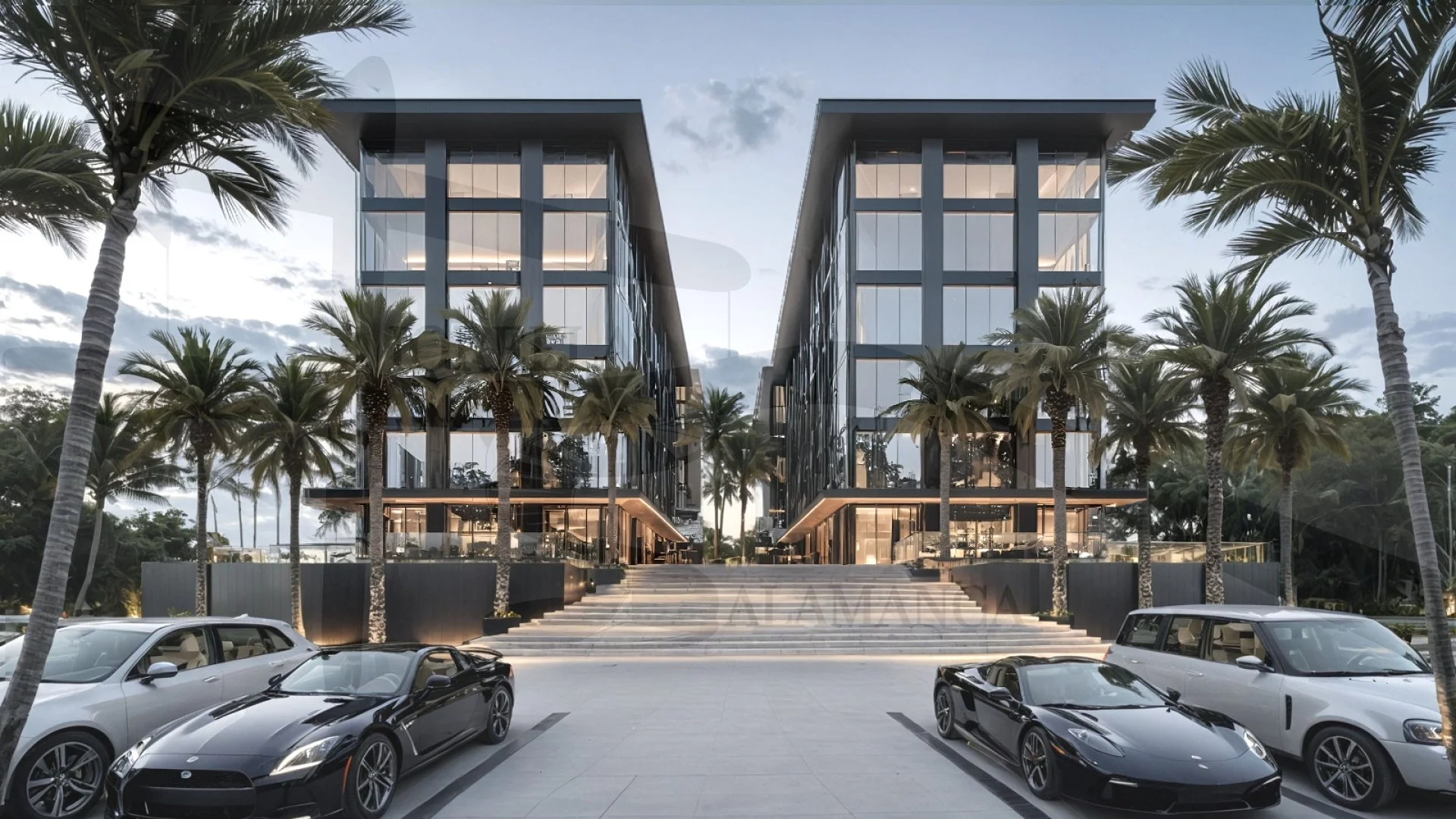 The master plan is organized around eight five-story structures, comprising four office buildings with activated ground-floor retail, and four residential buildings designed to accommodate a range of multi-bedroom layouts. The residential components offer a mix of two-bedroom, two-bathroom and three-bedroom, three-and-a-half-bathroom units, each carefully oriented to capture expansive beach views and natural light, while maintaining distinct architectural identities within a cohesive framework.